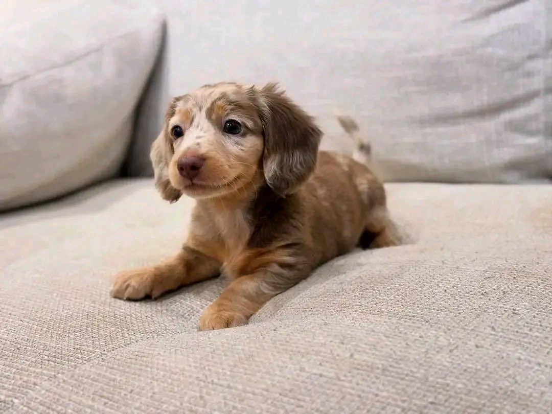 Rocky carries a Red Dachshund presentation with a bright, open visual mood, soft and natural coat definition, and sharp eye focus and confident frame posture. Photo analysis suggests a warm amber tone and playful curiosity and fast bonding instinct, which typically translates into stable engagement with familiar people. At 12 weeks and around 9.6 lbs, Rocky is in a prime window for routine shaping, trust building, and home-environment imprinting. Rocky's profile reinforces this: Calm temperament with affectionate energy. That behavioral pattern is ideal for consistent home bonding. For families seeking a companion with emotional availability and consistent attachment behavior, Rocky reads as a strong long-term match.